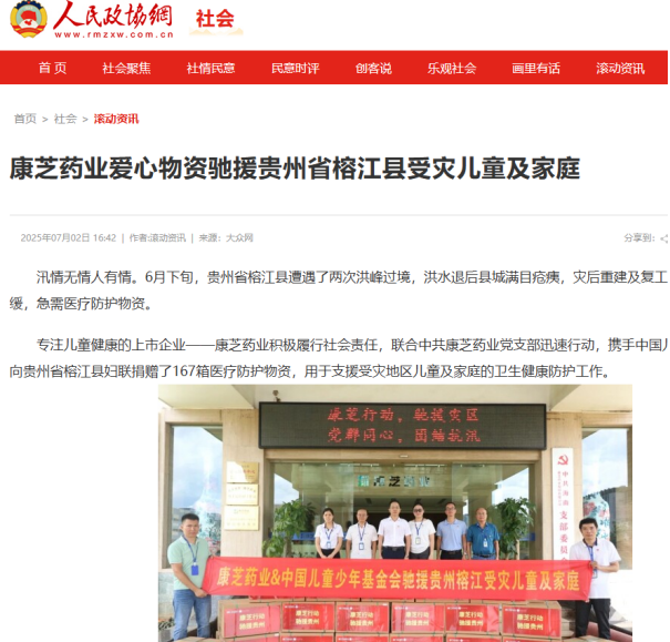 查看详情康芝药业携手中国儿童少年基金会,向贵州省榕江县妇联捐赠医疗防护物资,用于支援受灾地区儿童及家庭的卫生健康防护工作。