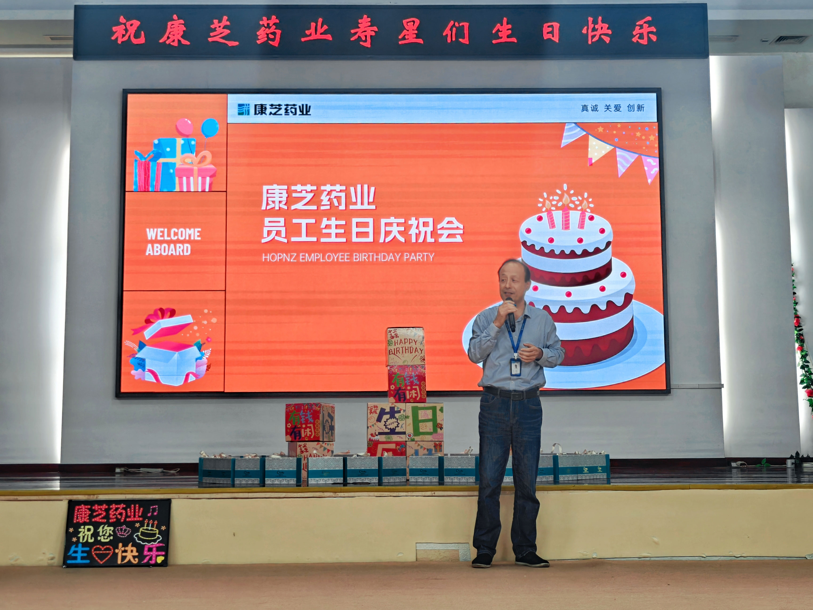 岁末年初,公司生产任务持续攀升,自2025年第四季度起,海南生产基地固体车间全体一线员工坚守岗位、全月无休,以高度的责任感保障药品供应,助力守护群众健康。生产车间内,十年、二十年工龄的老员工比比皆是,他们扎根康芝、默默奉献,用坚守与专业筑牢了生产保障阵线。为弥补忙碌中错过的生日仪式,本次生日会特别邀请2025年第四季度与2026年第一季度寿星同庆生辰,让关怀不缺位、温暖不停歇。